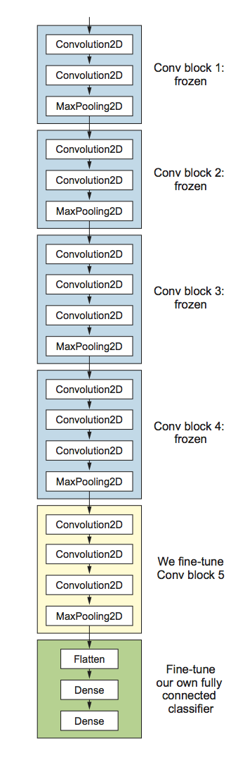 I stated earlier that it’s necessary to freeze the convolution base of VGG16 in order to be able to train a randomly initialized classifier on top. For the same reason, it’s only possible to fine-tune the top layers of the convolutional base once the classifier on top has already been trained. If the classifier isn’t already trained, then the error signal propagating through the network during training will be too large, and the representations previously learned by the layers being fine-tuned will be destroyed. Thus the steps for fine-tuning a network are as follows: