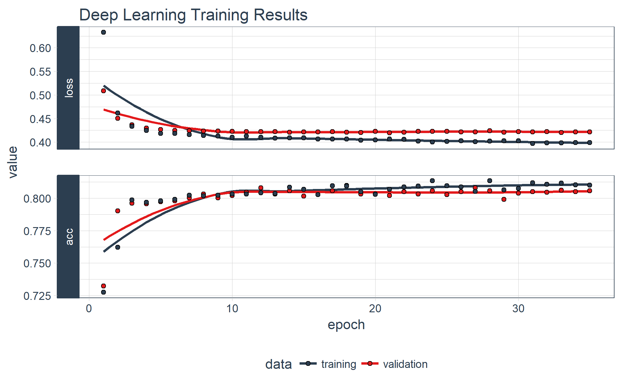 In this example we show you how to use keras to develop a sophisticated and highly accurate deep learning model in R. We walk you through the preprocessing steps, investing time into how to format the data for Keras. We inspect the various classification metrics, and show that an un-tuned ANN model can easily get 82% accuracy on the unseen data. Here’s the deep learning training history visualization.