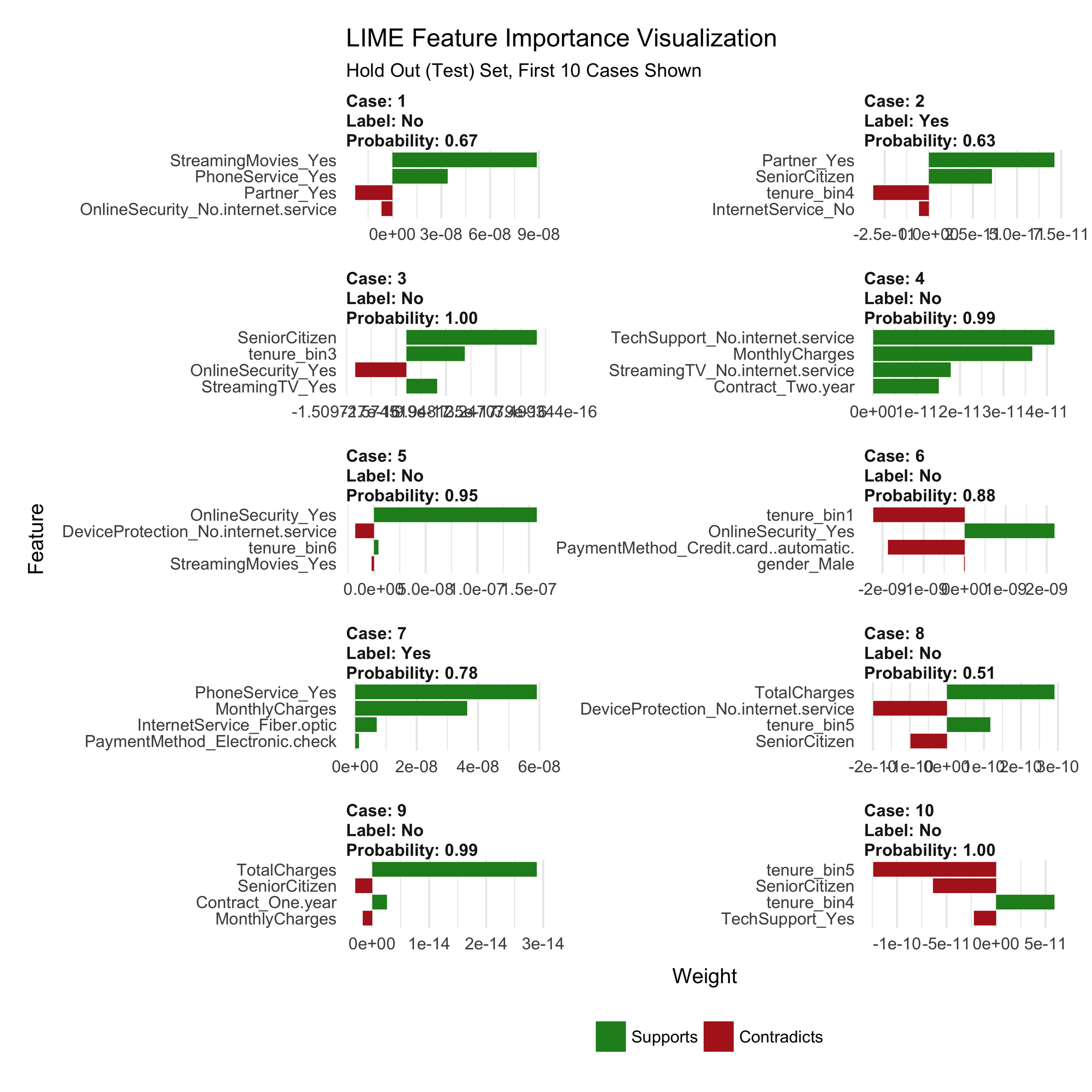 While LIME did not indicate this as a primary feature in the first 10 cases, the feature is clearly correlated with those electing to stay. Customers with fiber optic service are more likely to churn while those with no internet service are less likely to churn. Improvement Area: Customers may be dissatisfied with fiber optic service.