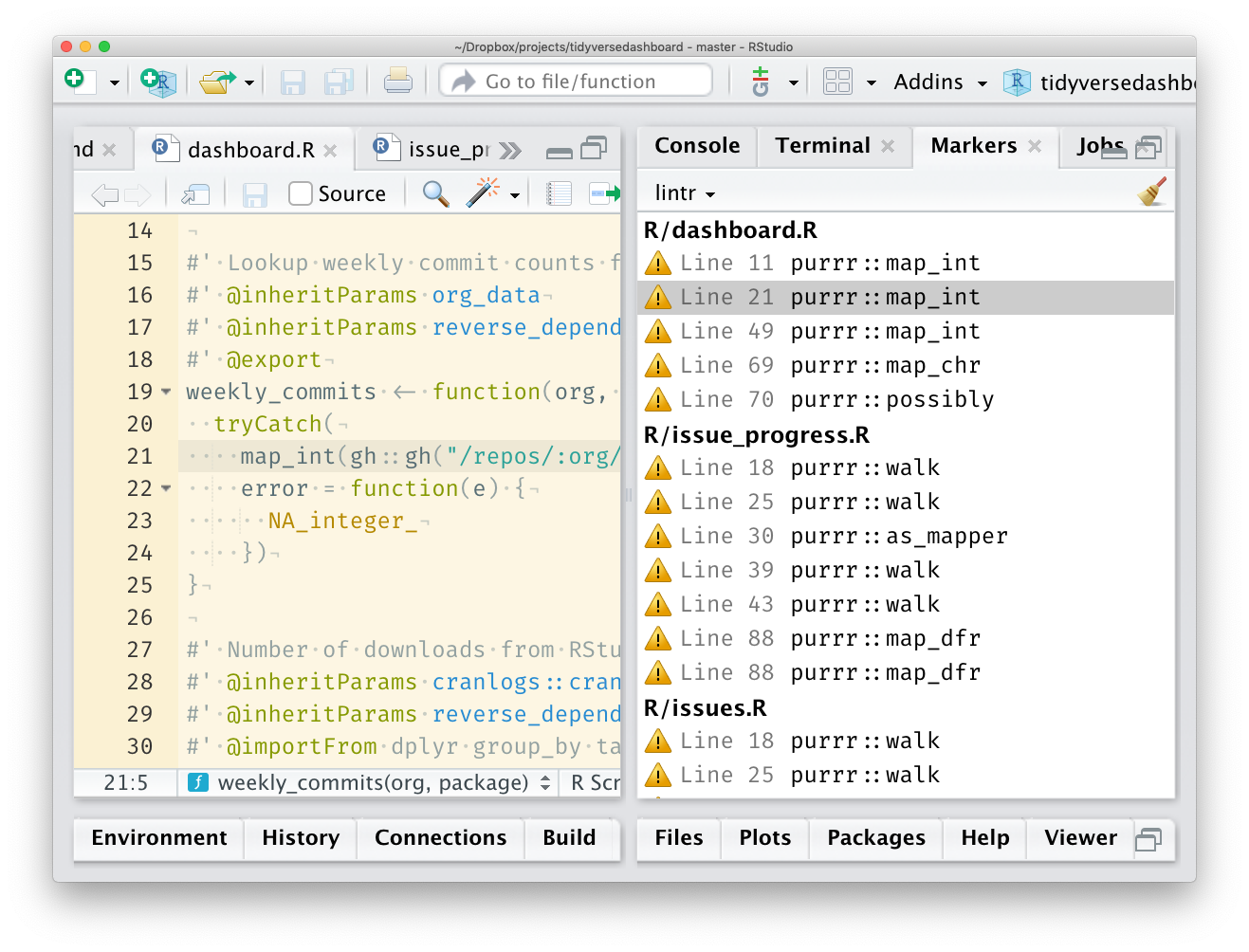 in RStudio the function will add source markers for all the locations, which