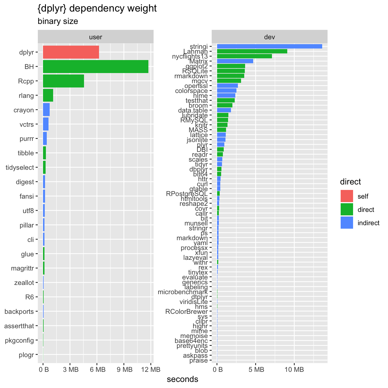 dep_plot_size()plots the pre-compiled binary size, which is often the more useful measure, as most users install pre-compiled binaries.