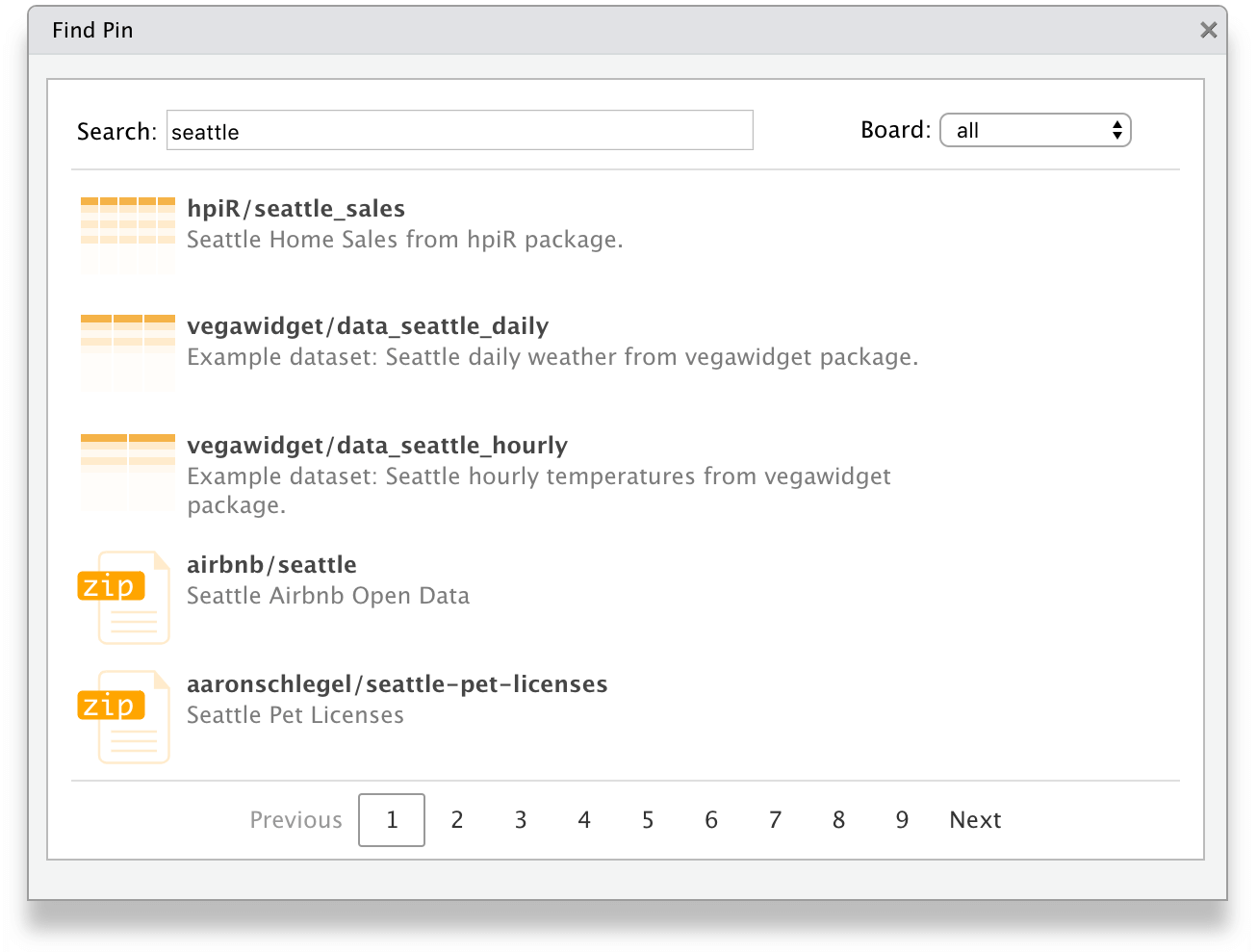 pin_find(). - Share resources on GitHub, Kaggle or RStudio Connect by registering new boards with