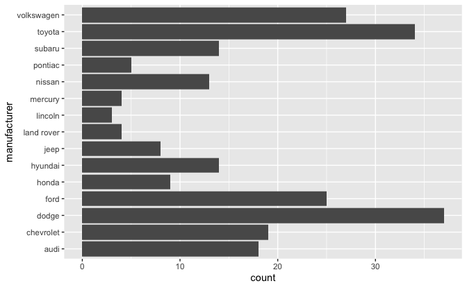 While we are messing with the foundation of ggplot2, we might as well challenge another paradigm, namely that certain geoms have a direction, and to change the direction you’d have to use coord_flip(). The prime example of this is a horizontal bar chart: