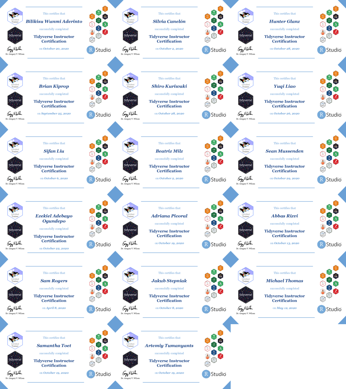 This brings the total number of certified Tidyverse instructors to 173, and the number certified for Shiny to 27, including our first instructors in Nigeria and Russia. If you would like to speak with any of them about your training needs, their contact information is on the trainers’ roster and they would be happy to hear from you.