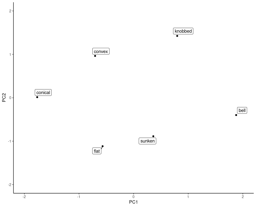 For visualization, it’s convenient to do principal components analysis (but there are other options, like t-SNE). Here are the six cap shapes in two-dimensional space: