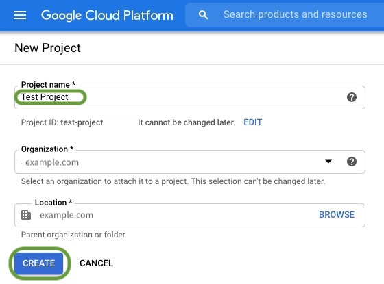 - Give your project a name. Here, we’ve named our project Test Project. Click Create once you’ve entered a name.