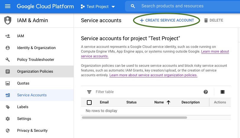 - Select Create Service Account. You now have a project created, but you don’t yet have a Google user account that can be used with that project. We’ll create that on the Service Account Details screen.