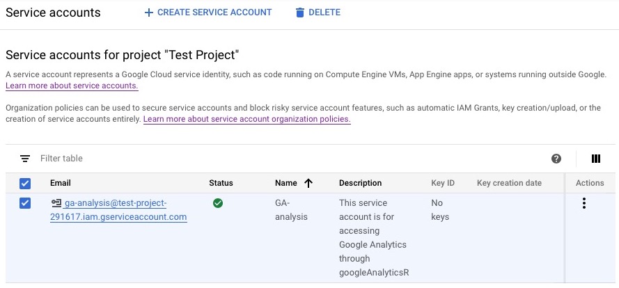 - Now that your service account exists, download your key from the three vertical dots menu. Once your account is created, the dashboard will take you back to the Service Accounts page as shown below.