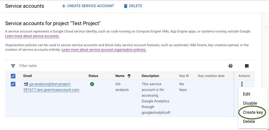 - Create your private service account key. Make your browser window wide enough to see the Actions menu with the three vertical dots. Click on those 3 vertical dots, and you’ll see a pop-up menu. Click on Create key.