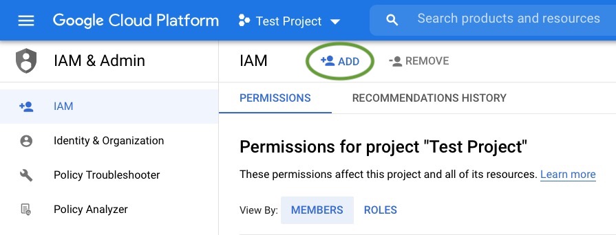 You now need to add the email associated with that key to the list of authenticated project users. To do this, we’re going to return to the Cloud Resource Manager pane at https://console.cloud.google.com/cloud-resource-manager.