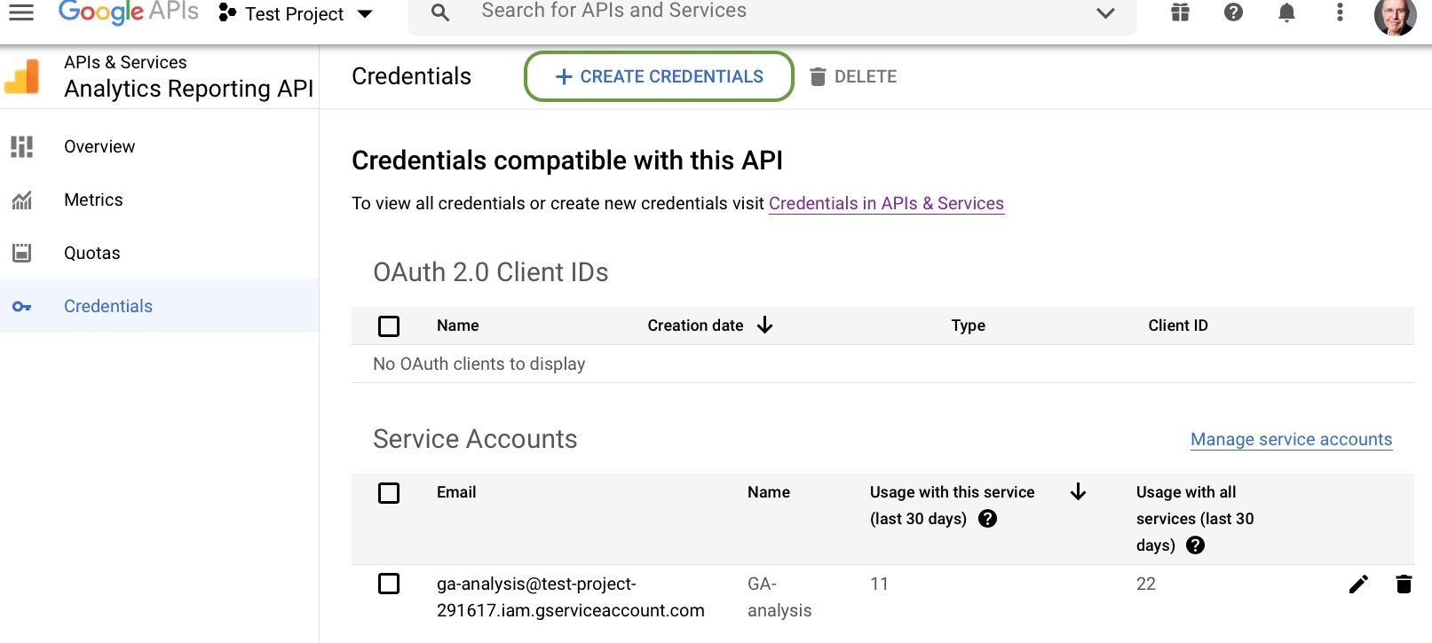 - Go to the site https://console.developers.google.com/apis/api/analyticsreporting.googleapis.com/. Please note that this is not the Google Cloud API dashboard we went to in Step 3; this is the Google Analytics Report API dashboard. You probably will have no OAuth 2.0 client IDs shown. Click on + CREATE CREDENTIALS at the top of the page.