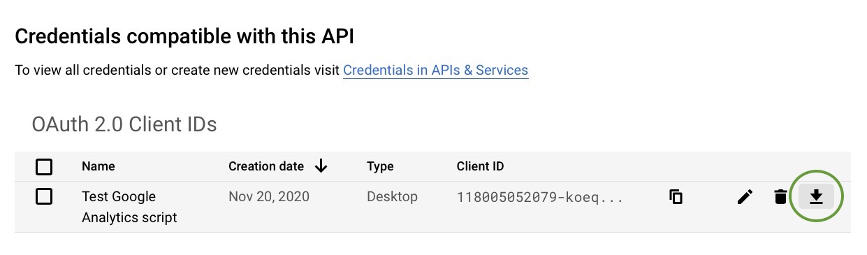 - Click the down arrow button next to your new Client ID to download the client ID JSON file. I typically put this file into my .secrets folder where I also keep my service account private key.