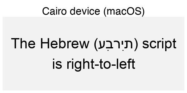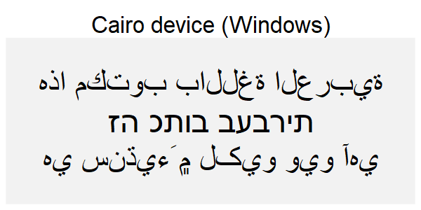 If you’re not familiar with the languages above it can be hard to see what is right and what is wrong. You may, however, look at how the text in the code is rendered in the browser and compare that to the device rendering. If you do that, you can see that the Hebrew script is rendered in the wrong direction for all the non-ragg devices (except Cairo on Linux). For the Arabic and Sindhi it’s even harder to see what’s wrong because the text looks fundamentally different. That’s because both Arabic and Sindhi rely extensively on text substitution rules and ligatures; the way a letter is written depends critically on what letters it is next to. Still, by comparing to the browser rendering you can see that the same devices failing on the Hebrew script fail here as well.
