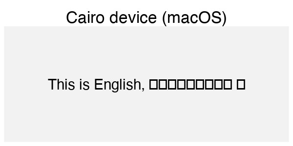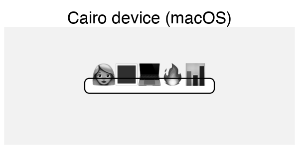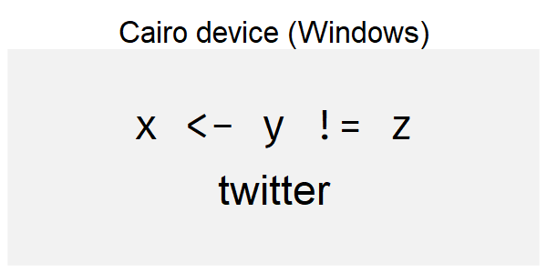 The Cairo device on Linux handles this task well, as we have noted above. How come this works, but only on one OS? Cairo is built in to most Linux distributions and is designed to work with Pango, the library that linux uses to layout text. R’s Cairo graphics device bundles Cairo on all platforms, but doesn’t include Pango, due to the challenges of building it on other operating systems.