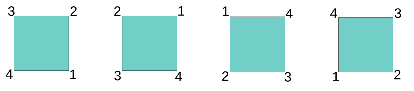 There are exactly four ways I could have rotated the square without raising suspicion. Those ways can be referred to in different ways; one simple way is by degree of rotation: 90, 180, or 270 degrees. Why not more? Any further addition of 90 degrees would result in a configuration we’ve already seen.