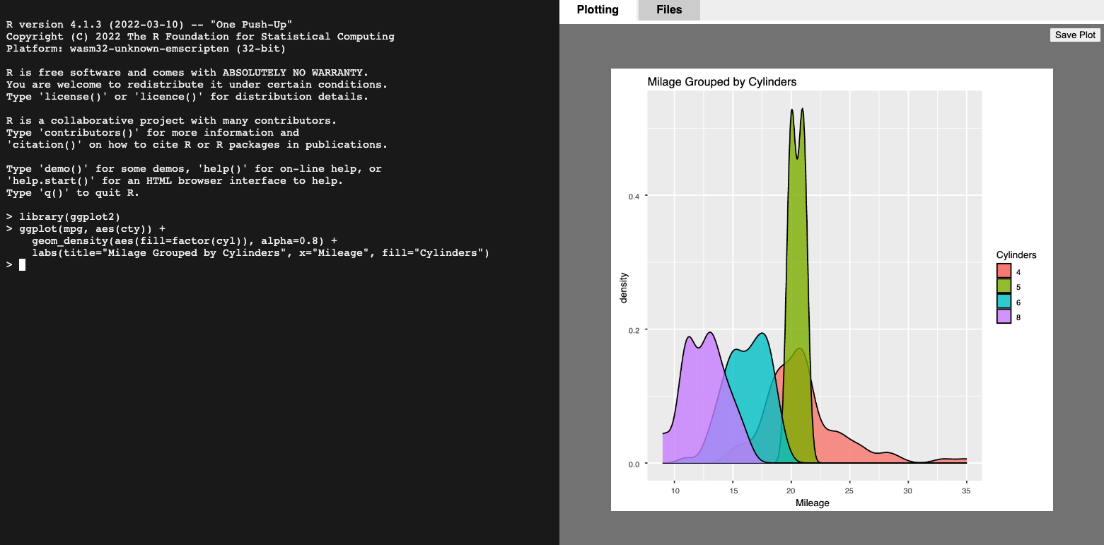 Plotting is also supported (Plotting tab, top right), meaning a user can produce beautiful plot output with the webR console, closing the loop of reading data, performing analysis, and producing output. It is entirely feasible that a casual user could perform the basics of data science entirely within their web browser using webR.