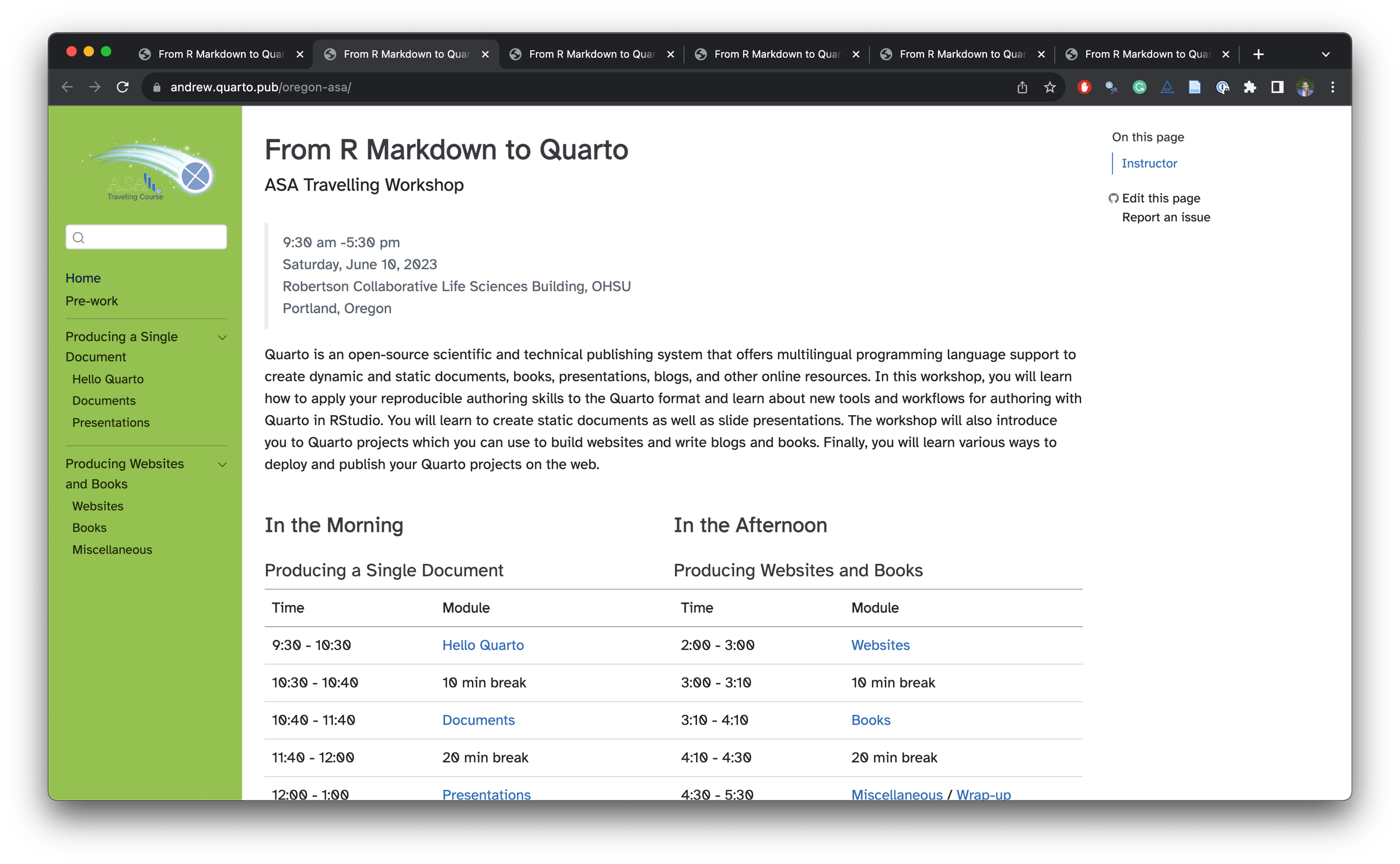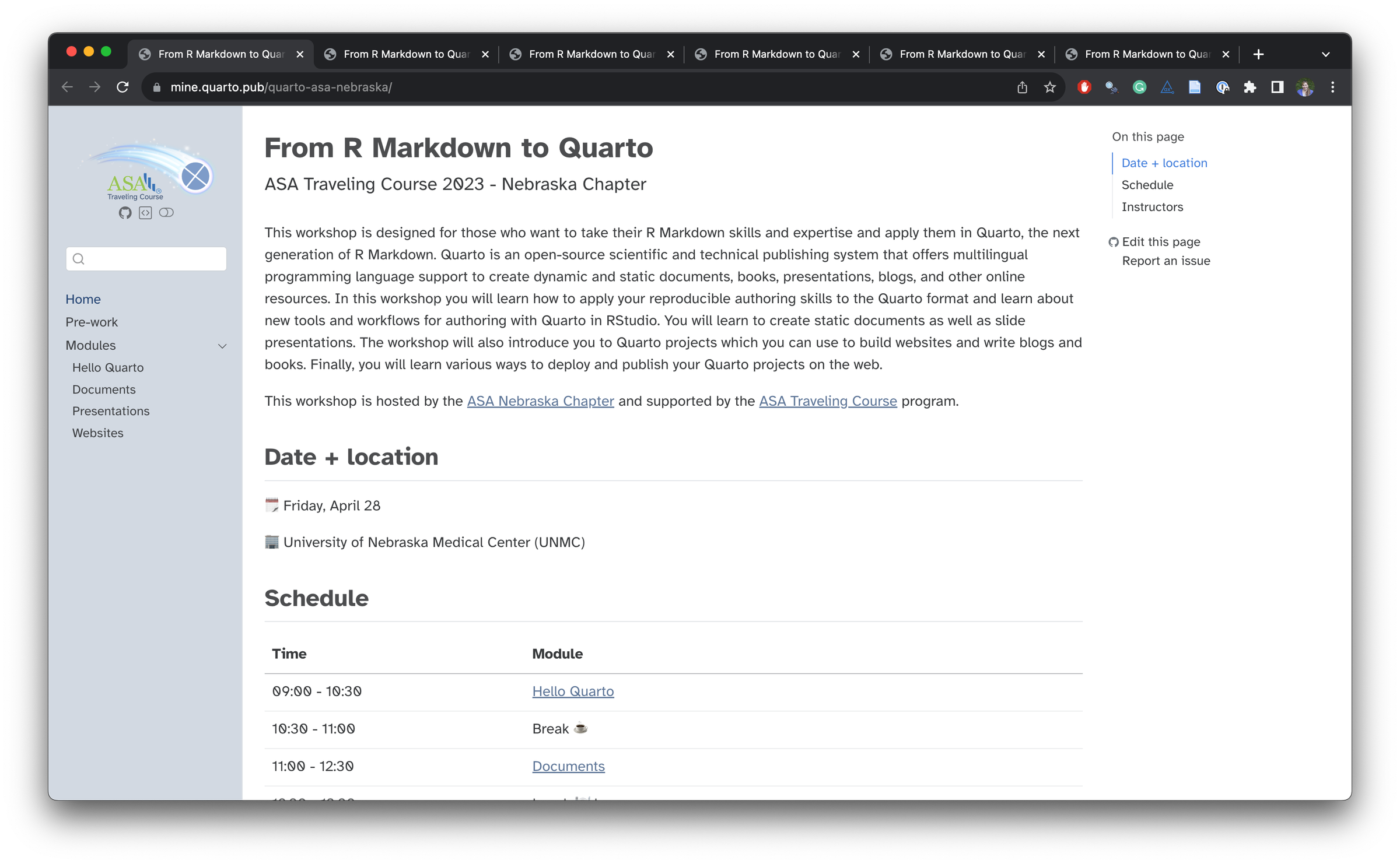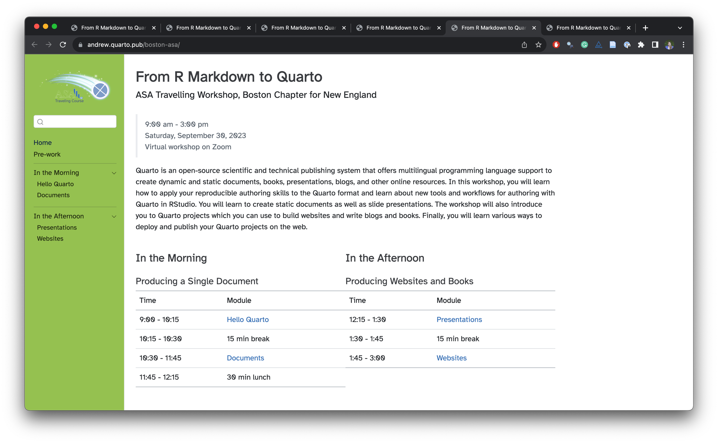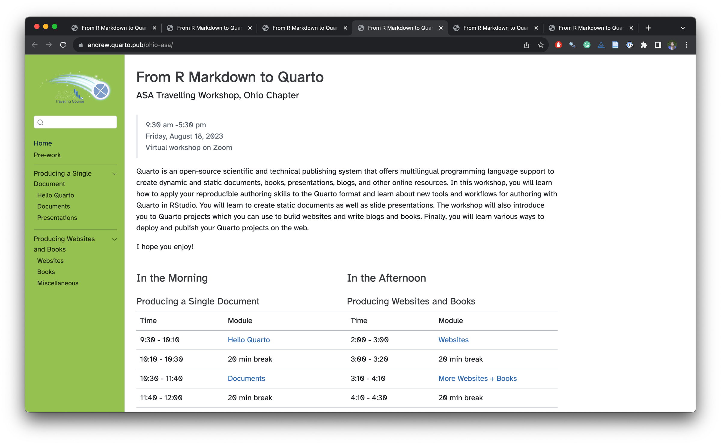 In 2023, Dr. Andrew Bray and I gave a series of six workshops on Quarto as part of the Traveling Courses program sponsored by the American Statistical Association .